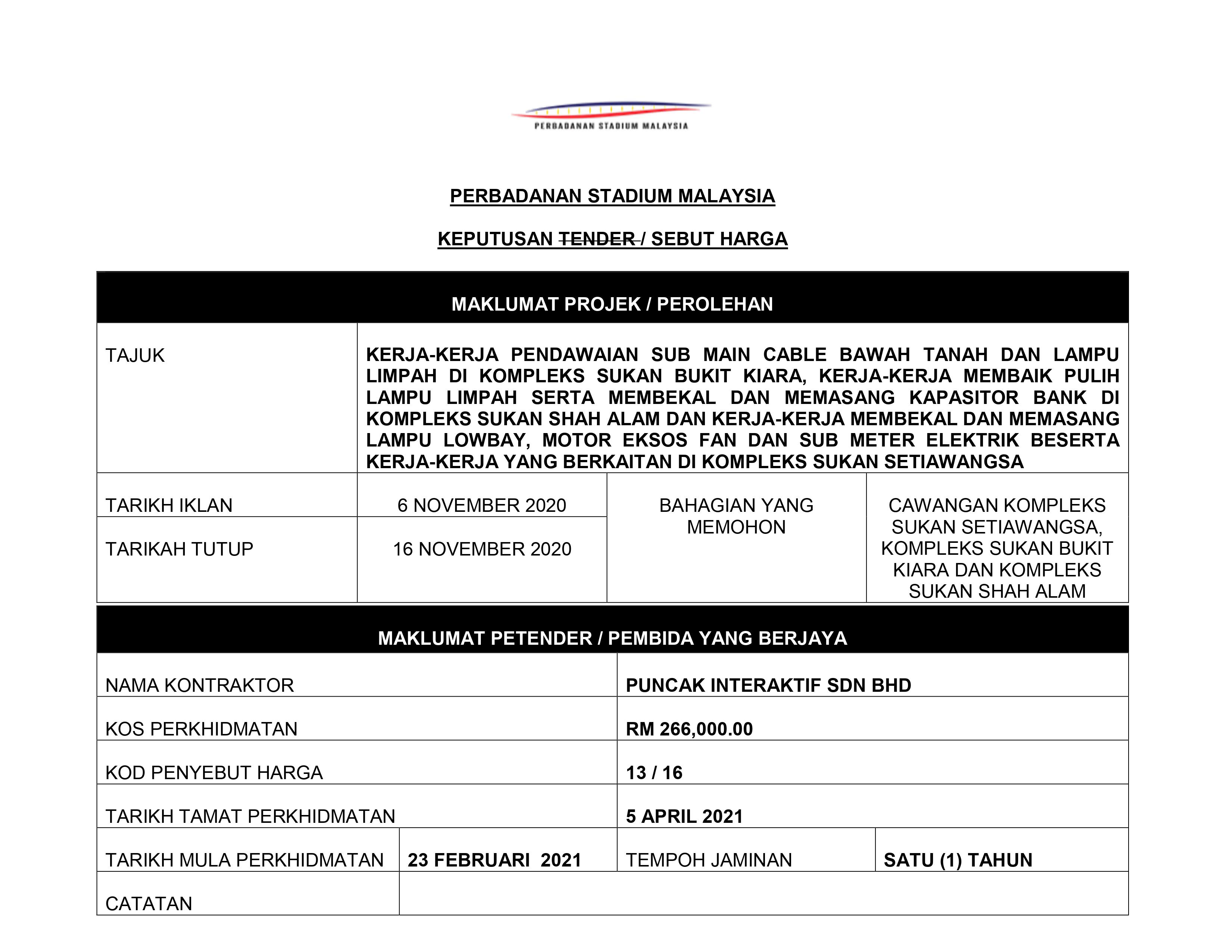 Laporan Keputusan Sebutharga Kerja-kerja Pendawaian Main Cable Bawah Tanah & Lampu Limpah Di Kompleks Sukan Bukit Kiara, Kerja-Kerja Membaik Pulih Lampu Limpah Serta Membekal & Memasang Kapasitor Bank Di Komplek Sukan Shah Alam & Kerja-Kerja Membekal...